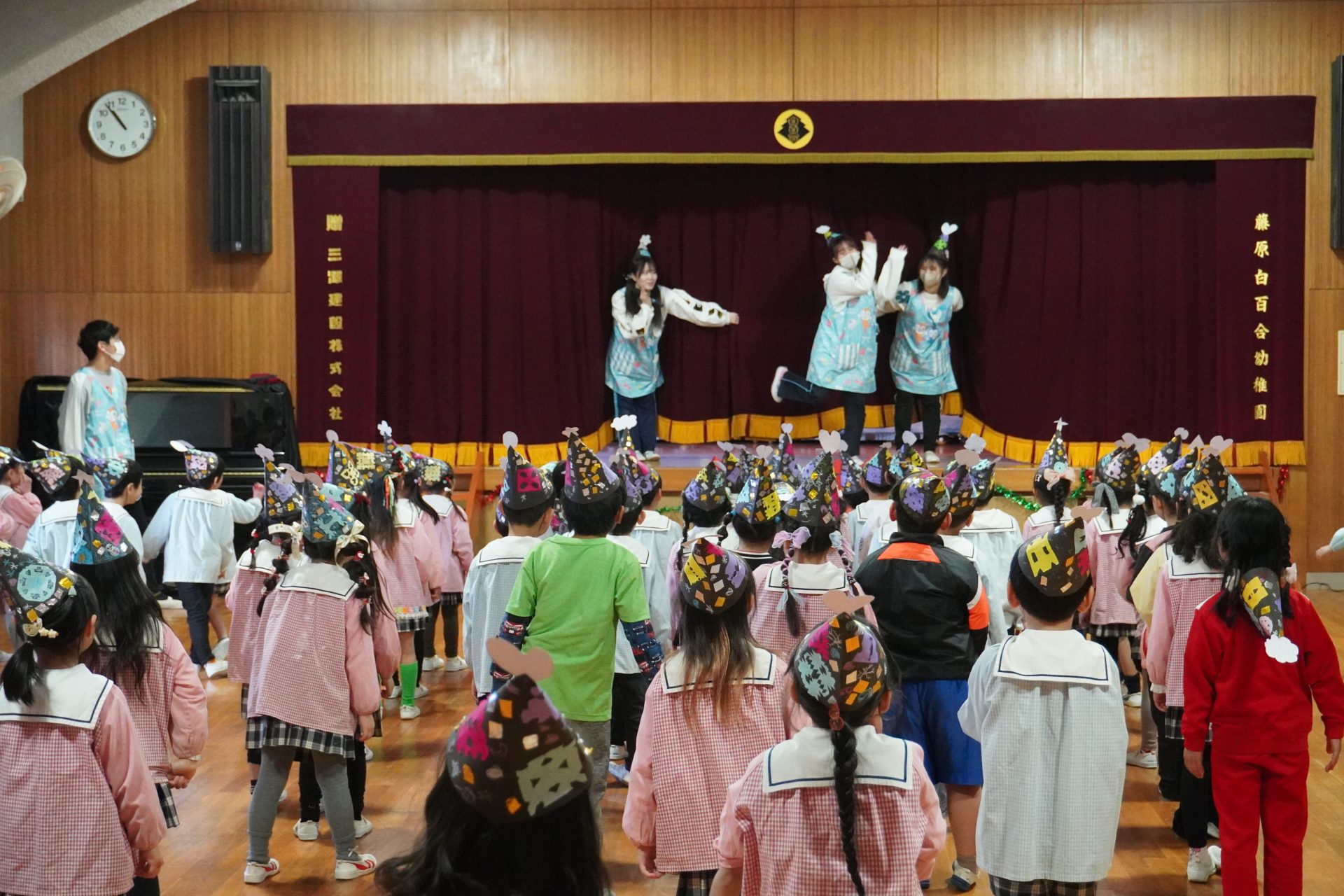 年少はカスタネットを使ったリズム遊び、年中ではピアニカや太鼓といった打楽器を行い、年長では木琴・鉄琴などの旋律楽器も演奏します。