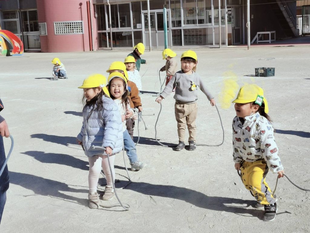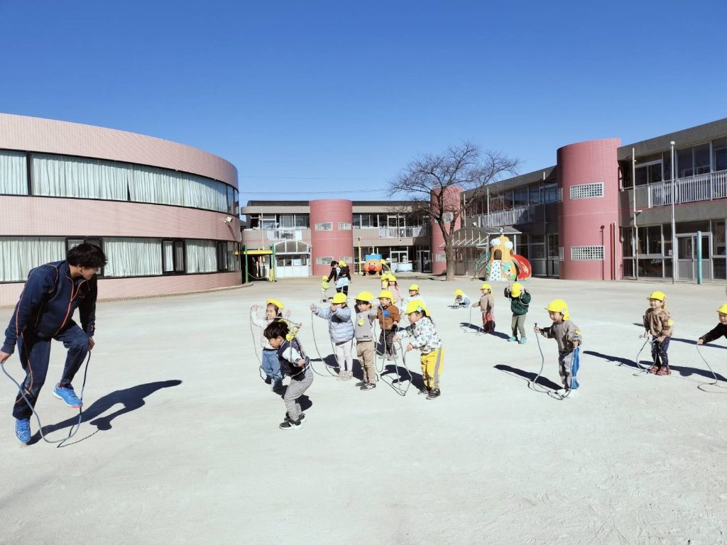 先日の体操でひよこ組はお外に出て縄跳びをしました!体操講師の髙橋先生と一緒寒さを吹き飛ばすように元気いっぱい体を動かしましたよ!