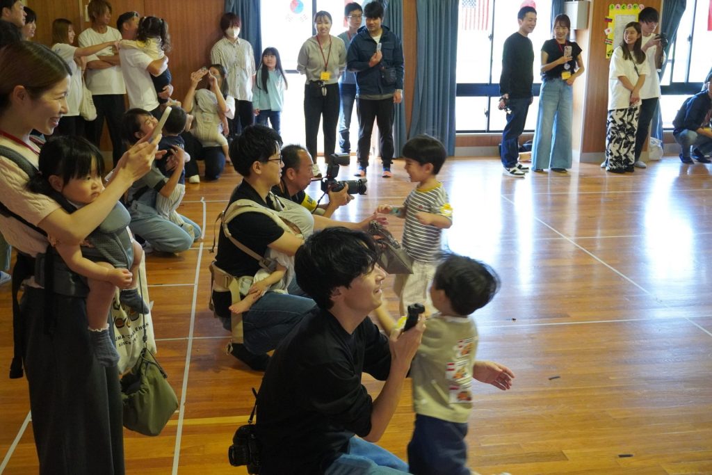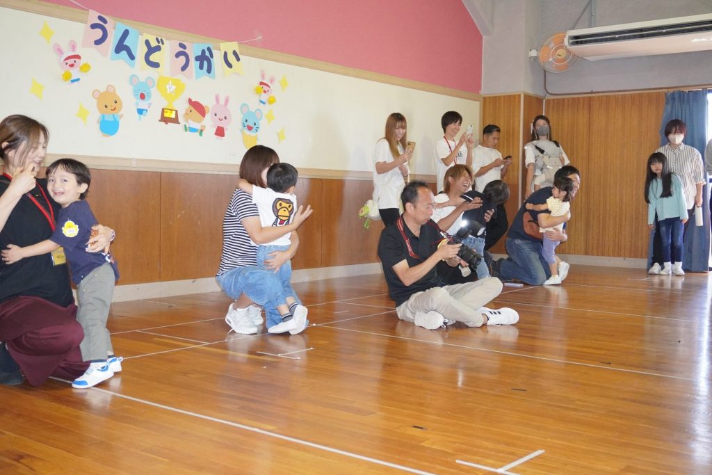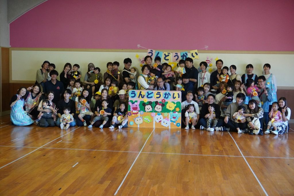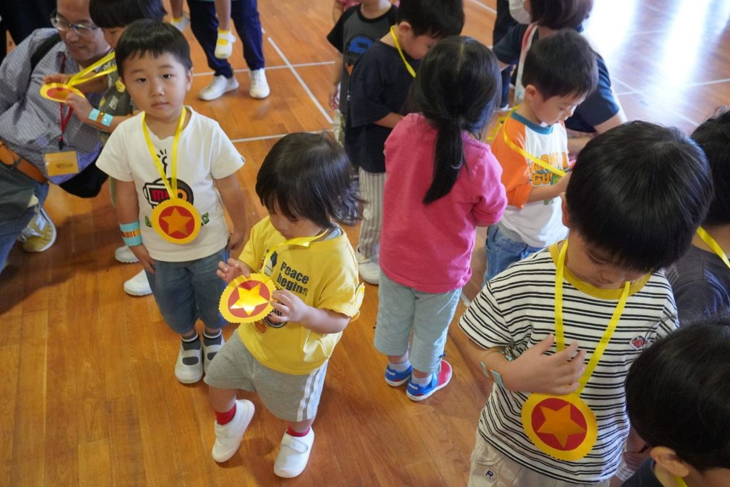 パパママのところまでかけっこしたり玉入れをしたり親子で楽しく運動して最後は頑張ったご褒美のメダルを首にかけてもらいました!
